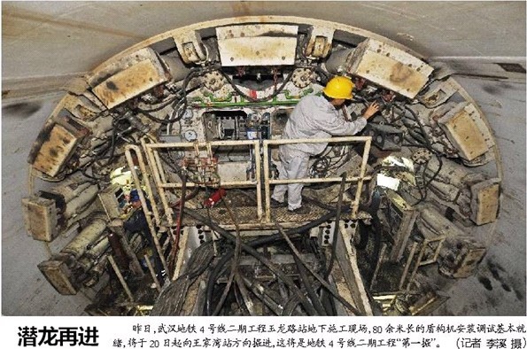 新闻图片拍摄于钟鑫公司玉龙路地铁项目部地下施工现场,报道以“潜龙再进”题,把汉阳市政一号盾构机比作潜入地下的长龙,蓄势待发,在即将开始的盾构掘进施工中大显身手。报道在文中指出,盾构机调试工作基本就绪,将开始武汉地铁4号线二期工程“第一掘”。