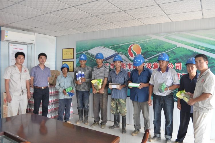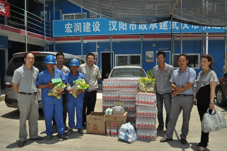 6月17日,武汉市气象局发布高温黄色预警。钟鑫公司立即开展了夏季高温慰问活动。当天下午,公司经理王智高、书记王繁、副经理郑佳、尹艳军、徐浩及工会干部等领导一行冒着高温酷暑慰问汉口北地铁项目部。在汉口北项目部,王智高经理等领导把矿泉水、绿豆、白糖等物资和防暑降温药品发放到农民工手中,并叮嘱项目部一定要保证农民工在高温时期安全作业,防暑降温物资要有限用于农民工。随后两天时间里,公司领导同志有先后为三号线六标地铁项目部、玉龙路地铁项目部以及江鹦路道路维修项目部、佛祖岭一路项目部和书城路项目部,并对现场农民工进行慰问。