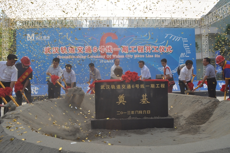 2013年8月6日,衔接汉口、汉阳的重要客运交通走廊、武汉市在建最长的轨道交通线路——轨道交通6号线一期工程隆重举行开工仪式。图为市委书记阮成发,市长唐良智,与市民代表、设计、施工、监理单位代表一起,为工程开工培土。