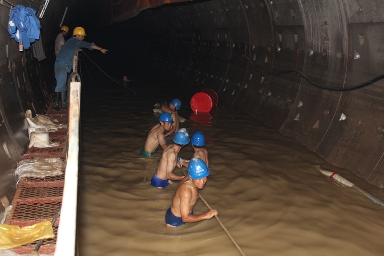 7月7日灾情发生后,玉龙路地铁东段头井基坑积水数米深,项目部立即投入排水抢修工作,集团公司董事长胡红胜亲自带队抢险,抽调十余台大型抽水泵、25吨泵车到施工现场,项目经理及现场管理人员一人负责一台抽水泵的拼装,绑铁丝、拧螺丝,自己动手,公司总经理王智高、支部书记王繁亲自安排抽水泵下井工作,经过三十多个工人三天的艰难抢险,终于将隧道中积水排出,一个星期后成功抢救出被淹没的盾构机。之后盾构维修人员不畏艰难,跟泥土和水灾作战,将一个个零件拆下来进行清洗检修,公司还从海瑞克公司专门聘请两名专职技术人员现场指导维修,电气系统更换配件,重新调试,液压系统也送到专业维修机构进行清洗维修,一个多月里解决了一个又一个难题,终于将盾构机修好,具备再次始发的条件。