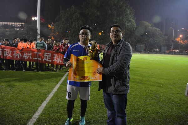 11月4日晚上7:00,2016年第九届“汉阳市政杯”职工足球比赛决赛在新华路体育馆外场举行,由汉阳市政集团队与新区代表队争夺冠亚军。在观众的加油声中,汉阳市政集团队不负众望,最终以3:1的比分获得了本次比赛的冠军。钟鑫市政公司在比赛中表现优异,荣获优胜奖。集团公司与各分公司领导均出席了闭幕式。闭幕式上我公司涂轶铭书记为冠军队伍进行了颁奖,最后由我公司方紫微总经理致闭幕辞。到此“汉阳市政杯”2016年职工足球比赛闭幕。