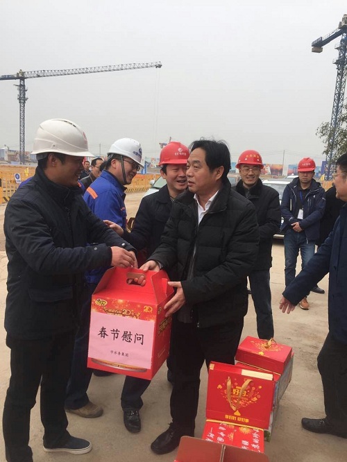 在夹套河骨干箱涵工程施工现场,金国发董事长嘱咐各个工程标段项目部要切实把职工生活安排好,为施工人员做好后勤保障。当得知整个夹套河箱涵工程仍有500余名工人在春节期间坚守施工一线,他深情地表示,工人们舍小家顾大家,为了武汉箱涵工程项目建设争分夺秒,郑重代表城投公司广大干部职工向工人们表示了最真诚的感谢,并致以新春祝福。李兵总经理嘱咐大家在节假日施工时要科学组织,全面统筹协调,精心布局,节日期间坚持施工精神可嘉,但始终要牢记安全生产这一条主线,万万不能丝毫麻痹大意,同保工程安全质量与进度,建设精品箱涵工程,为大武汉城市排水防涝工程建设贡献力量。