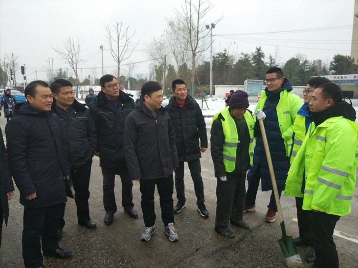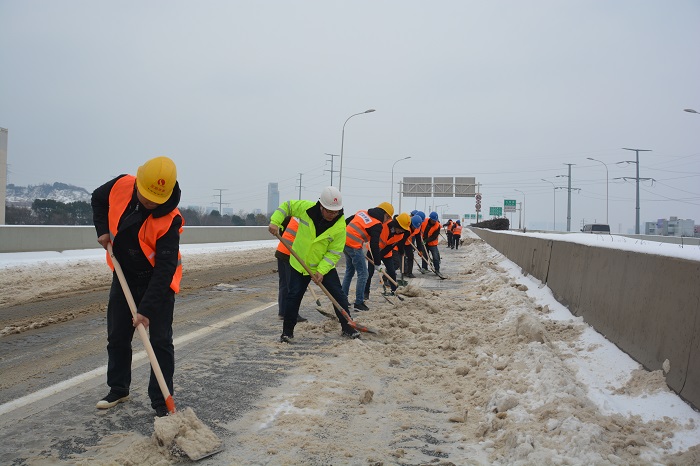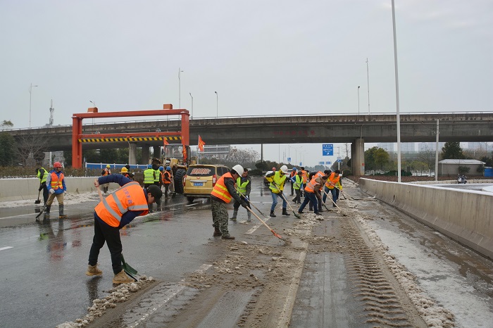 时间来到28日上午8时,在三环线百威路—长丰桥路段,钟鑫公司迅速调度六大项目部150人和铲车、农用车数台,集体前往三环线高架进行除雪破冰。8点钟的三环线高架,格外清冷,最低温度甚至达到了零下6度!可是当你置身于抢险现场时,却完全感觉不到寒意——只因为大家全身心的投入到抢险工作中,一把把铁锹挥舞得那么有力,一条条产雪破冰后的路面是那么干净整洁,现场气氛是那么的热烈。期间更是迎来了汉阳区委书记马泽江、汉阳市政集团公司董事长严悌文等领导来到抢险现场指挥工作,为正在抢险的“铁军”们鼓劲加油,大家干劲更足了,精神更振奋,最终在下午13:30将三环线百威路—长丰桥路段路面积雪清扫完毕。
