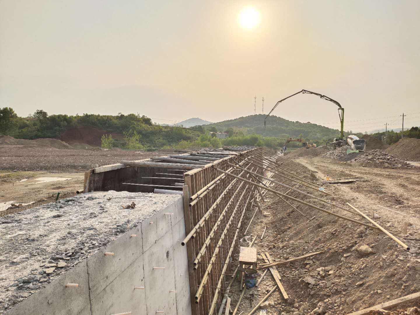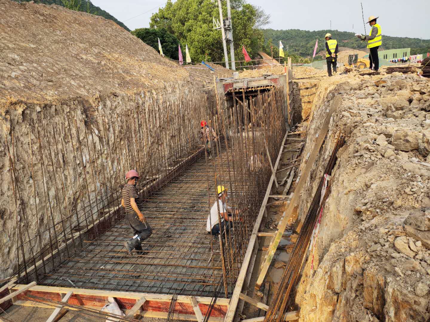 截止1月底,挡土墙施工完成300米,累计完成27%;雨水管道完成300米,累计完成27%;挖方完成6.6万方,累计完成63.2%;填方完成4万方,累计完成93.7%。受疫情影响,2个月处于停滞状态。为保障项目安全有序复工,尽快把失去的工期“抢”回来,该项目部第一时间了解当地复工复产要求以及寻求武汉政策支持,分期分批进驻项目现场。严格按照疫情防控方案落实各项工作,全体员工租住当地居民民房,一栋两层,分别作为会议室和住宿,按照一人一间房安排住宿;项目现场通过微信群、宣传标语和现场展板等方式积极开展宣传,施工现场采取了封闭式管理、实行全员戴口罩,提前储备了口罩、护目镜、消毒水、温度计等防疫物资,保障项目现场防疫物资不中断;每日为项目人员测量体温、入场检测实名登记、进入项目车辆及人员定时消毒和分批就餐等手段切实做好施工期间防疫工作。确保了防疫生产“两不误”。整个项目部团结一心,鼓足干劲,奔着共同目标毫不松懈,挑灯夜战赶进度,争分夺秒抢工期。通过加大人、材、机的投入、增加断面等多种方式加快施工,截止4月16日,挡土墙完成施工220米,累计完成520米,完成47.27%;截洪沟沟槽开挖150米,混凝土浇筑100米,完成9%。工程进度严格按总进度计划有序进行。