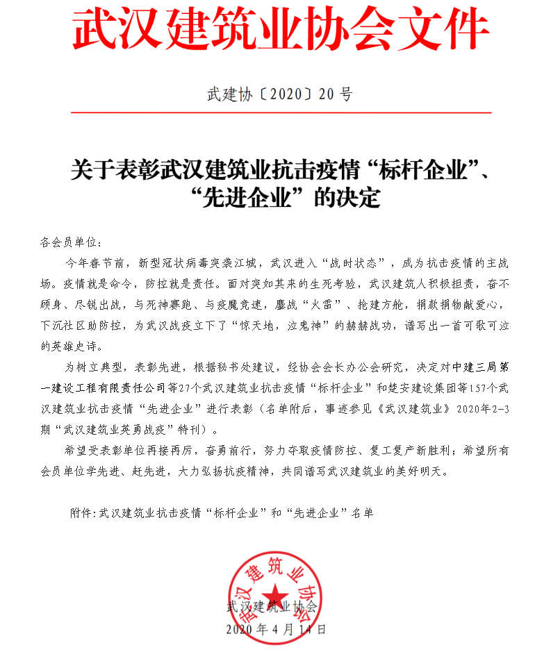 近日,武汉建筑业协会发布《武建协20号——关于表彰武汉建筑业抗击疫情“标杆企业”、“先进企业”的决定》,对在抗疫“主战场”积极担责,奋不顾身、精锐出战,与死神赛跑、与疫魔竞速的27家武汉建筑业“标杆企业”、157家“先进企业”进行表彰。汉阳市政钟鑫市政公司在抗疫过程中主动作为、勇于担当,获评“先进企业”荣耀称号。
