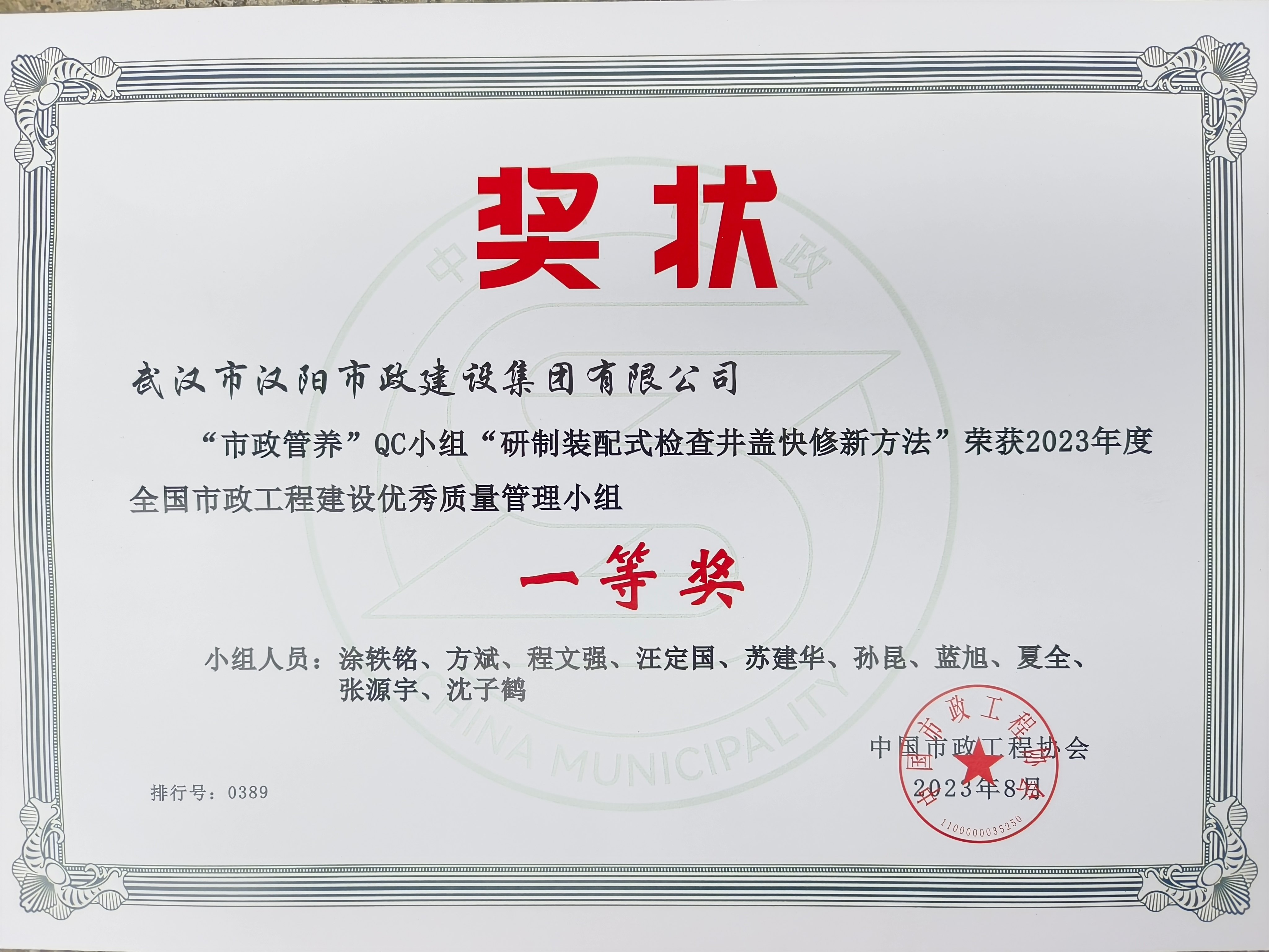 最终,通过查阅检查井相关资料、实地勘测勘察、试验分析,沈子鹤团队探索出一套装配式检查井盖快速维修施工新技术。此项针对传统维修技术存在的井盖座易变形、施工完成后养护期长、质量难把控等问题进行改进,采用T型“六防”井盖与道路同色混凝土预制装配形成整体,相对常规维修方案使井盖底座与原路面凹槽受力面扩大,可以很好地解决检查井区域不均匀沉降的问题;同时,其安装速度快,可很好适应道路维修施工作业时间短的特殊情况。目前装配式检查井近千座应用试点效果良好,优化工艺降本增效。“ 研制装配式检查井盖快修新方法”获中国市政工程协会一等奖、湖北省市政工程协会一等奖;“装配式检查井盖快修工艺研发”获湖北省建设工程质量安全协会一等奖。